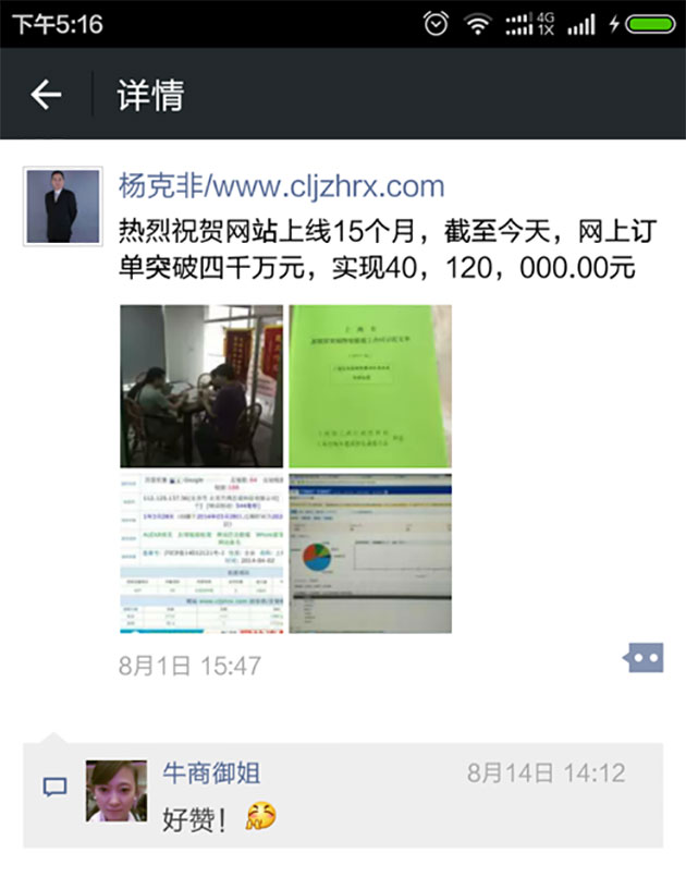 “走进牛商网,接受系统的培训让刚德快速融入网销,从企业定位,运营推广,到网销团队组建培训………全套服务无论从哪个环节来看,都做得非常完善,这是牛商网帮我们网站取得成果的最大亮点,是众多网站公司所不具备的。现在我能带领80后、90后做网络营销,指导着全国最大的永发保险箱公司,和牛商网的服务分不开的,感谢牛商网。“