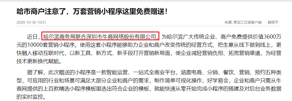 此次牛商网赠送的价值3600万元的10000套营销小程序,受到哈尔滨众多企业的欢迎与认可, 地方官方媒体也纷纷报道这一喜讯,对此提出肯定。