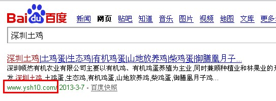 深圳土鸡这个关键词排在了百度首页第一的位置,获得了主要的客户群体的流量来源